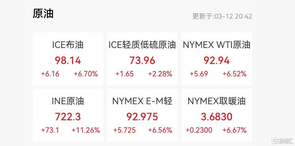 截至发稿,布伦特原油大涨超6%至98.14美元/桶,WTI原油涨超6%至92.94美元/桶。