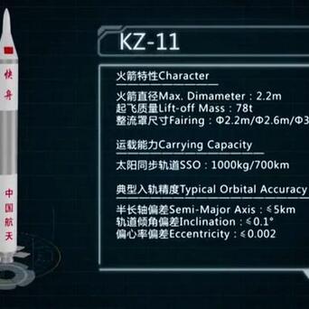 该火箭采用的是三级固体发动机和上面级液体发动机串联式构型,火箭全长25米,起飞重量78吨,箭体直径2.2米,拥有1吨的太阳同步轨道运载能力和1.5吨的近地轨道运载能力。