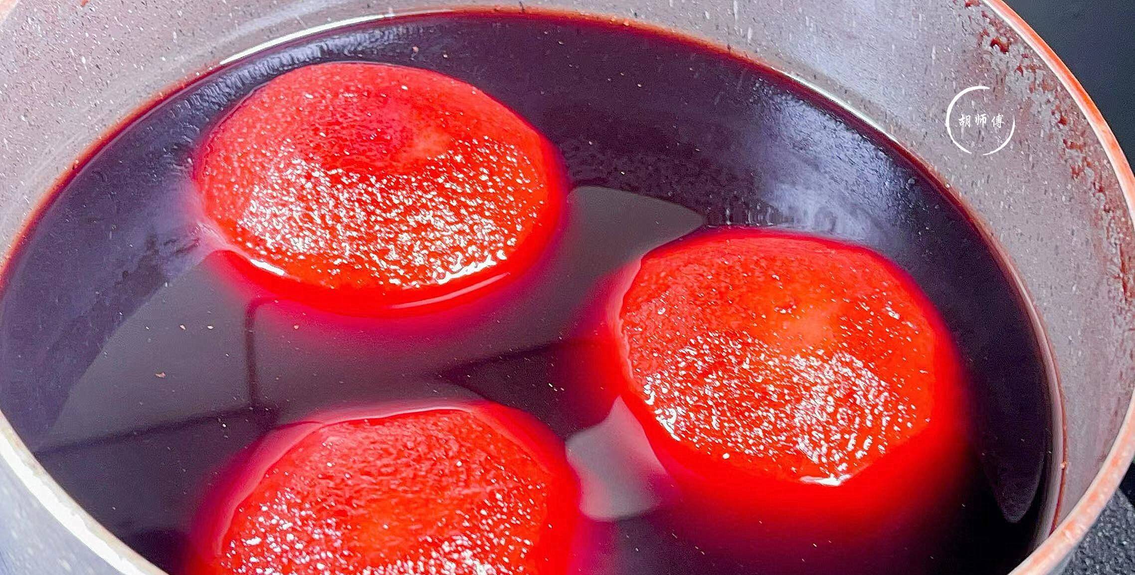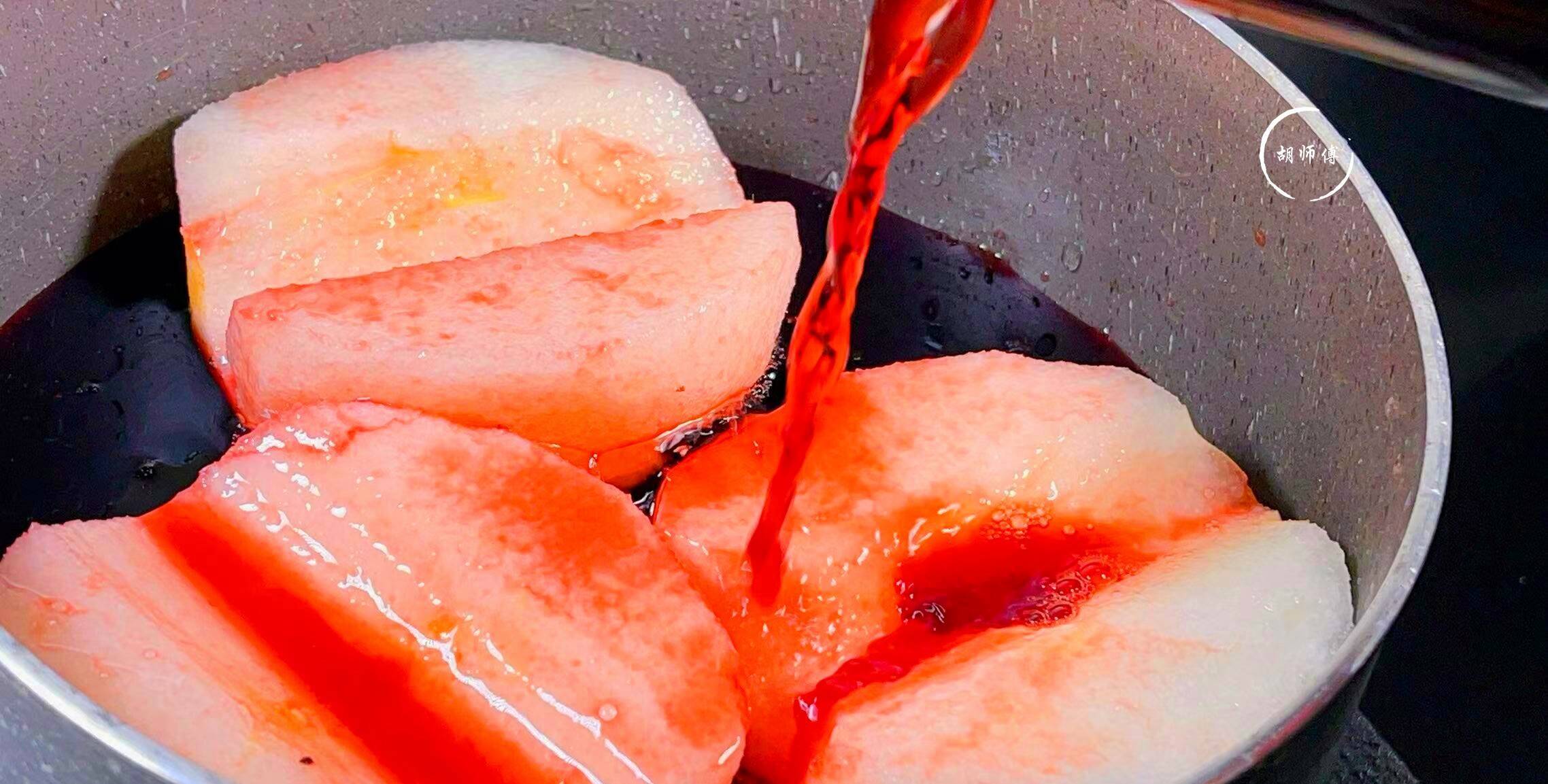 第四步:煮好的雪梨,不要立即捞出,此时雪梨中间的肉还是很白的,所以我们要继续将雪梨浸泡2小时,这样才能使雪梨更充分的入味。