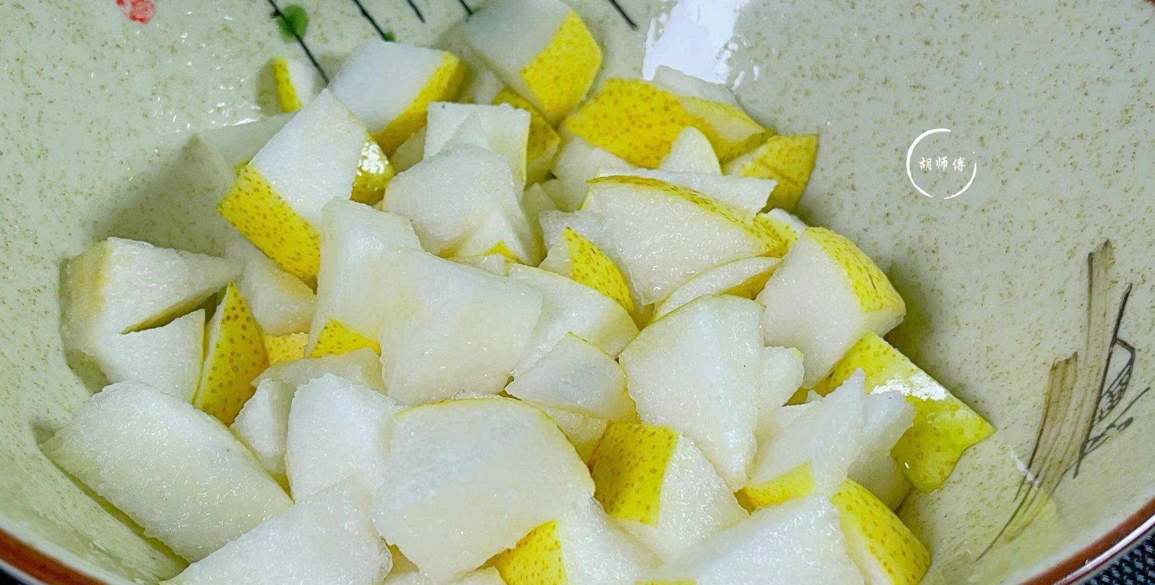 第一步:将雪梨表面打湿,然后撒上一点点食盐,将雪梨表面搓2分钟后冲洗干净,接着再把雪梨切成1厘米左右的正方形备用。