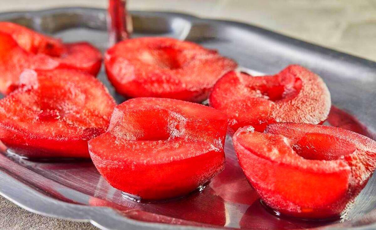 第五步:等雪梨泡好后,就可以将雪梨捞出直接食用了,还可以将红酒雪梨切成片吃,这样可以吃的更有味道。