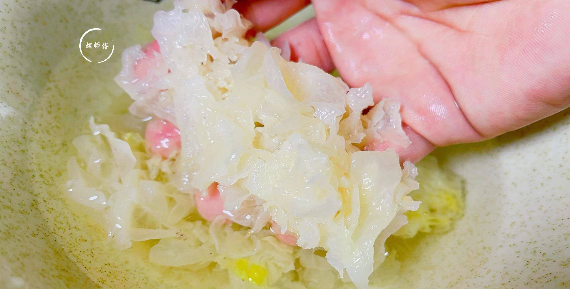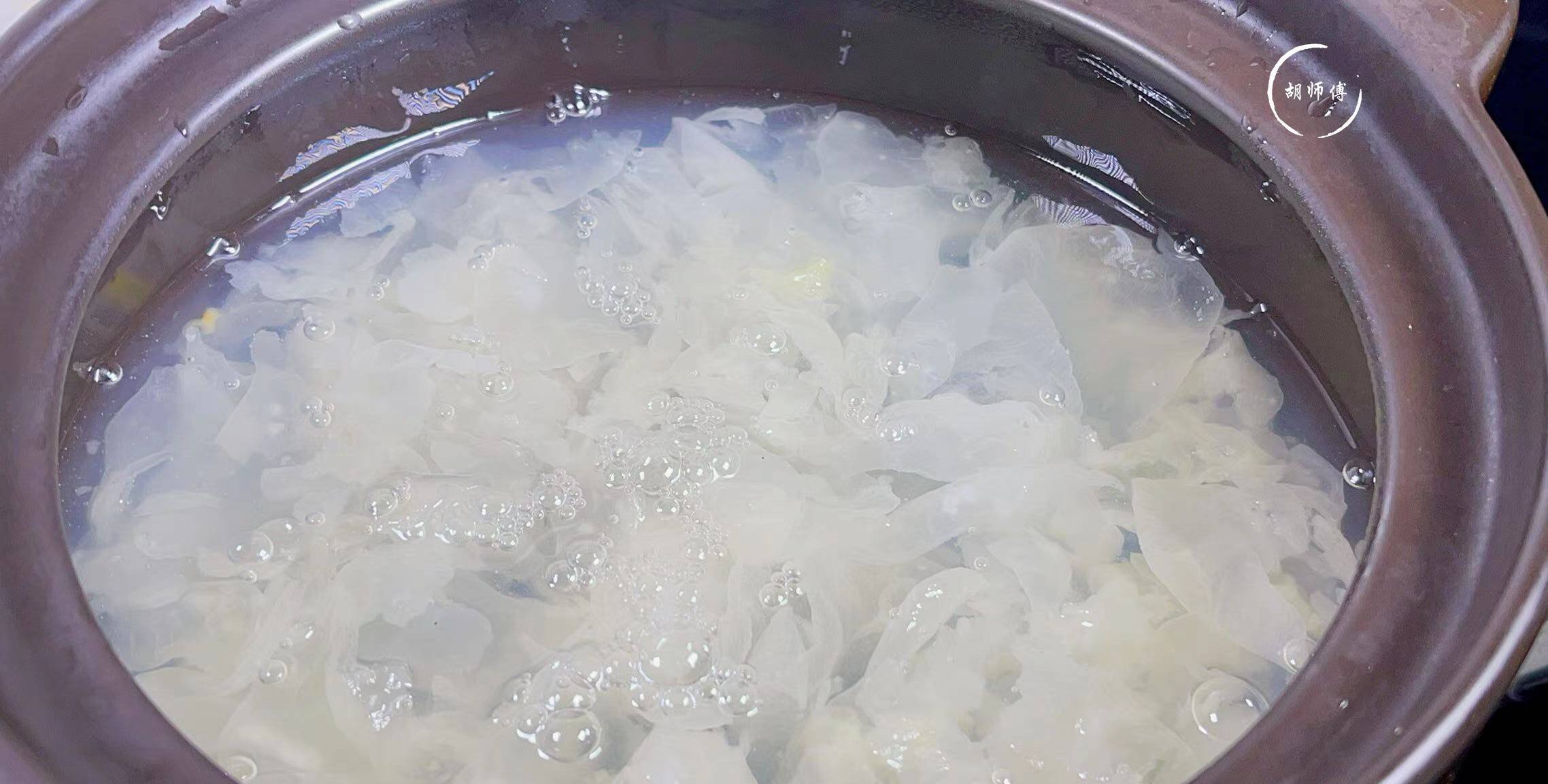 第三步:把银耳和适量热水放入砂锅中,开中火,将银耳炖30分钟后关火,不要揭开锅盖,继续焖30分钟,此时银耳就会出大量的胶。