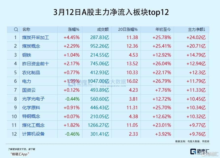 截至收盘,煤炭开采板块大涨4.45%,煤化工板块涨近2%,郑州煤电、兖矿能源、陕西黑猫、华电能源、潞化科技、金牛化工等十多只标的涨停,大量龙头单日净流入均超亿元。